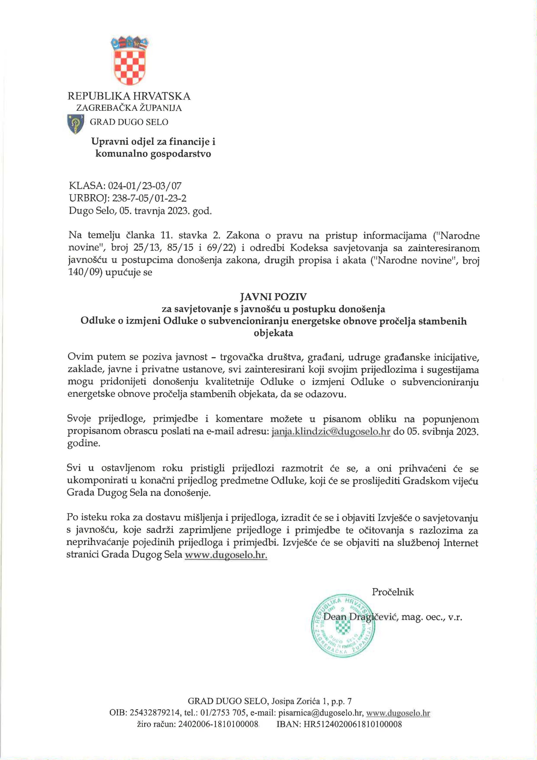 Javni poziv za savjetovanje s javnošću u postupku donošenja Odluke o izmjeni Odluke o subvencioniranju energetske obnove pročelja stambenih objekata