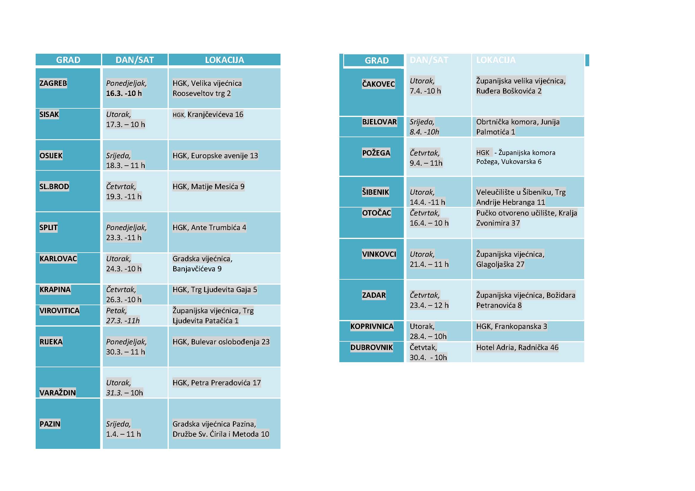 Prva radionica održat će se 16. ožujka 2015. godine, s početkom u 10 sati u Hrvatskoj gospodarskoj komori, Rooseveltov trg 2, Zagreb.